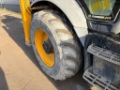 The machine is equipped with a 4-1 bucket, pallet forks, quick coupler function, 4x4 drive, and an extendible stick.